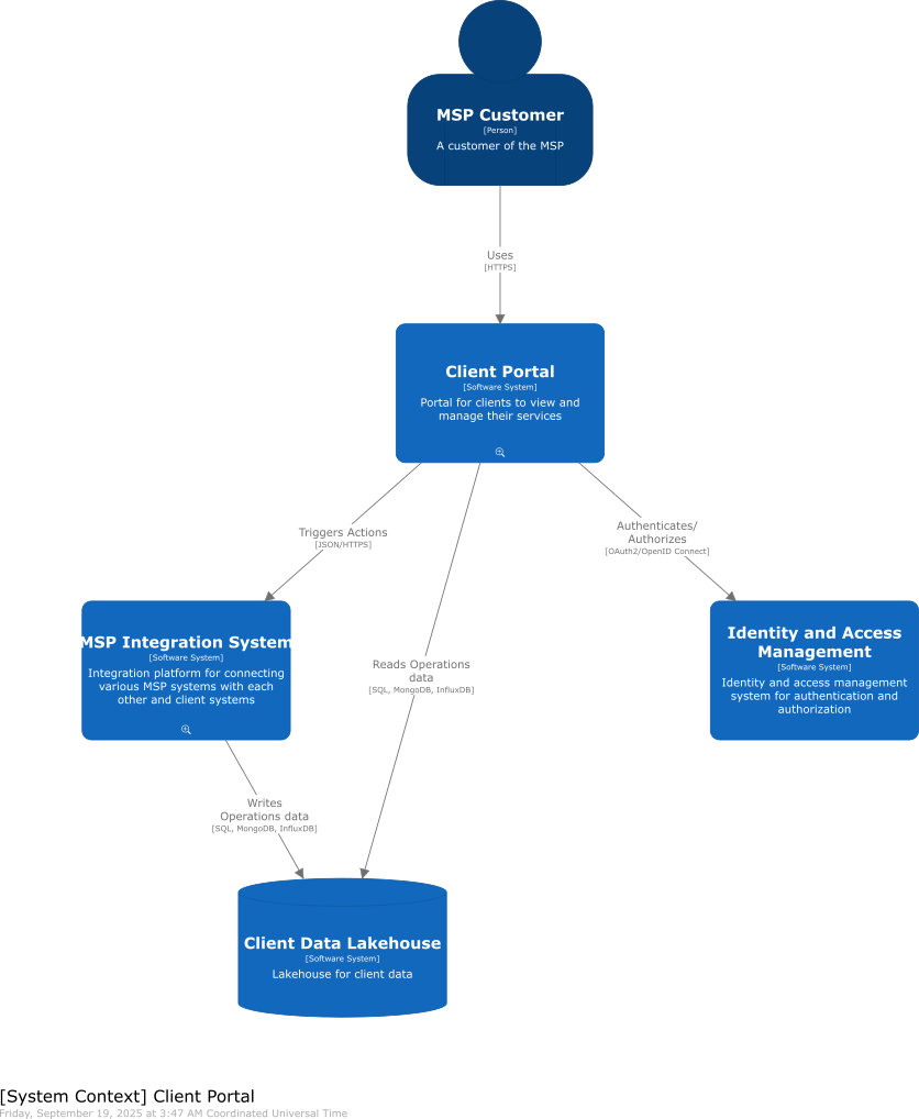The System Context diagram for the client portal system. Shows how the client portal sources information directly from the data lake-house and interacts with other systems through the MSP Integration System